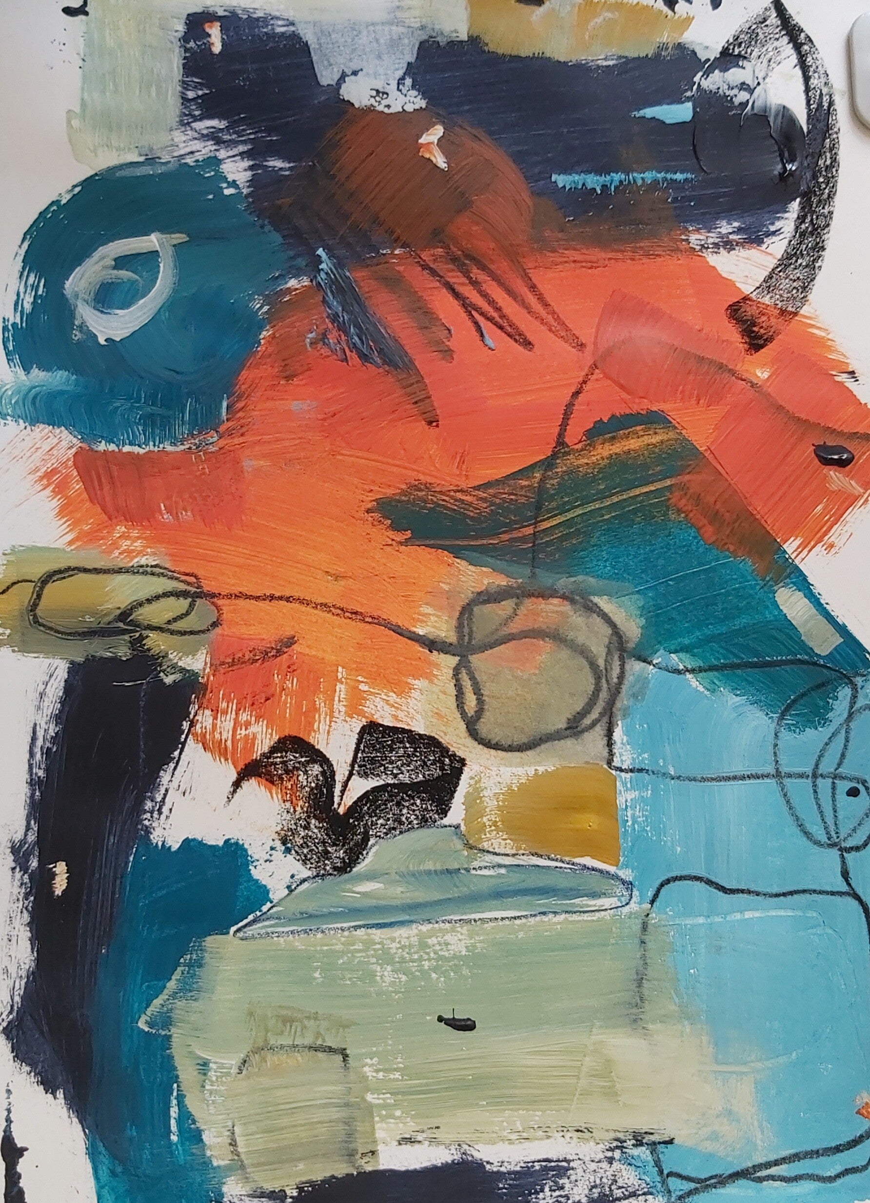 Verschillende lagen verf/inkt over elkaar, het experiment, verschillende materialen maken samen een boeiend geheel waarmee ik de kijker uitnodig zelf met zijn hart de aantrekkingskracht hiervan te ontdekken.
